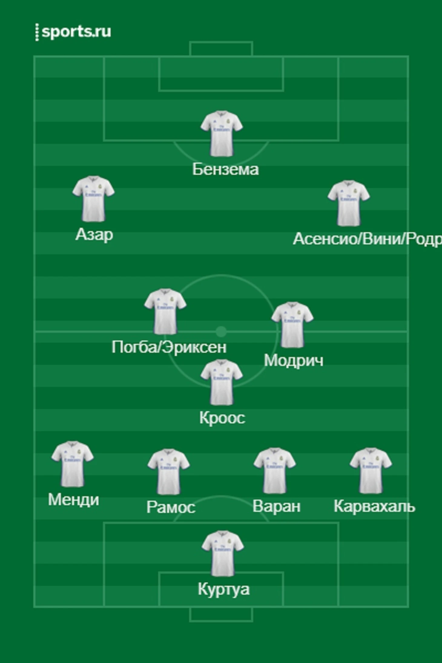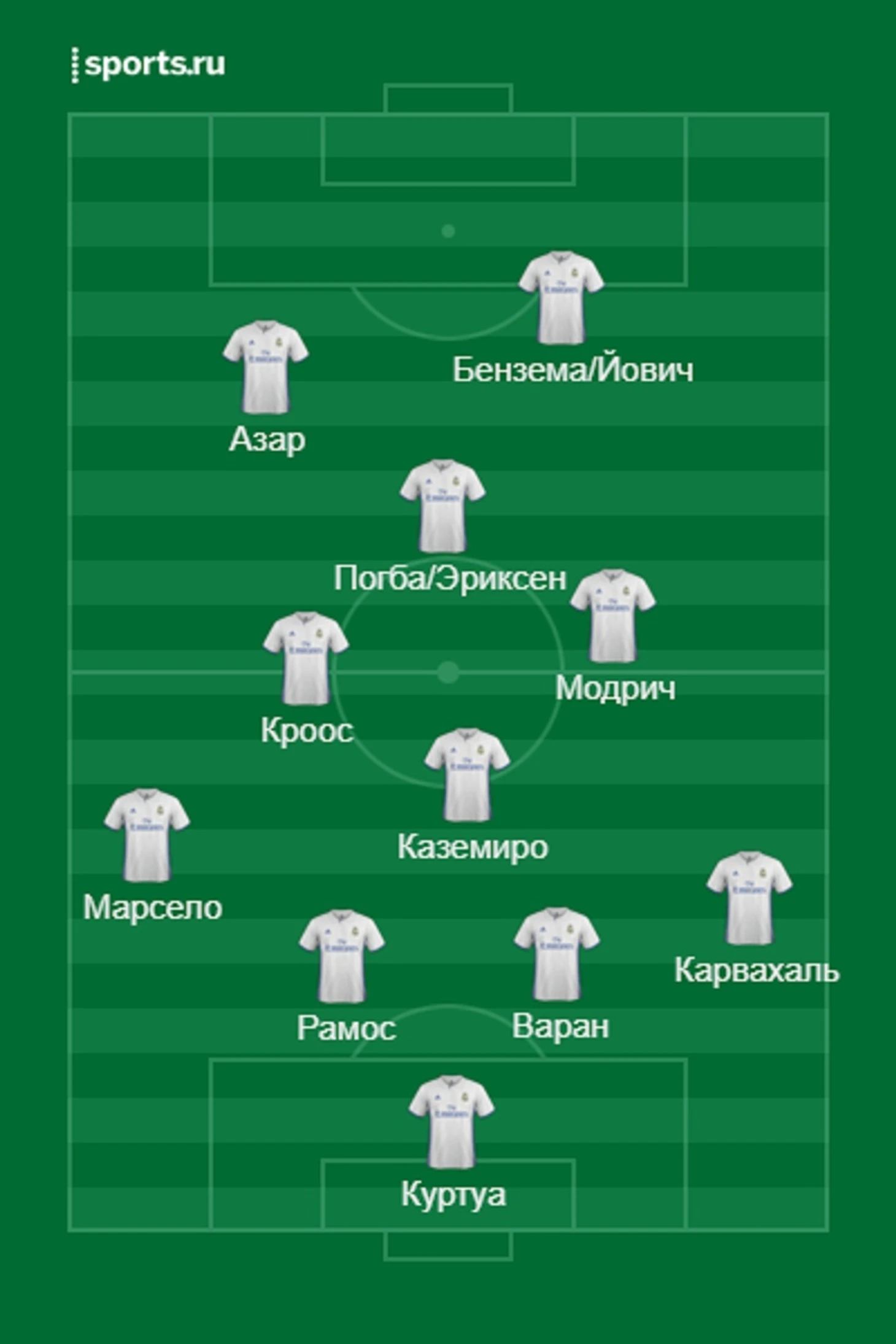 Раз нет Каземиро, то Марсело в схеме быть не должно. Кроос займет место, которое занимал при Анчелотти, а Погба (держим Эриксена в уме) будет играть чуть выше на одной линии с Модричем. Это позволит ему чувствовать себя свободно и активно врываться в штрафную, бить по воротам и использовать свои лучшие качества.
