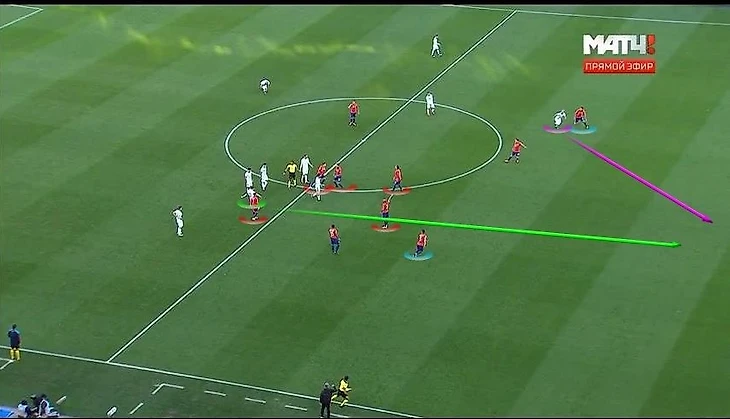 Снова прессинг, снова высокий прессинг от игроков сборной Чили. Такое ощущение, что тренерский штаб не хочет признавать реалий о возрасте своих футболистов. Для чего нужно играть так высоко, когда в твоем составе находятся больше половины игроков от 30 лет и выше.
