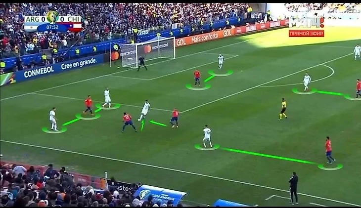 Я также указывал причины провала в игре по схеме 4-3-3 против Перу в прошлой статье. Но и здесь чилийцы устремляются в массивный прессинг, который оголяет тылы в обороне. То, что нужно для таких футболистов как Месси, Дибала, Агуэро. Оборона не справлялась в очередной раз с ускорениями аргентинских нападающих, а также была не способна перекрывать свободные зоны после потери мяча или неудачного прессинга.