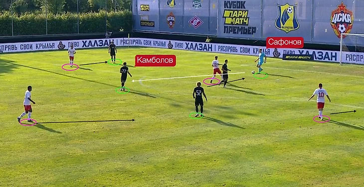 Тем более, Камболов пока не выглядит очень надёжным вариантом в этом компоненте – много игры невпопад, позиционных промахов, плохих передач (понятно, нужно прибавлять во взаимопонимании с новыми партнёрами). При этом Руслан неплохо помогает атаке вторым темпом.