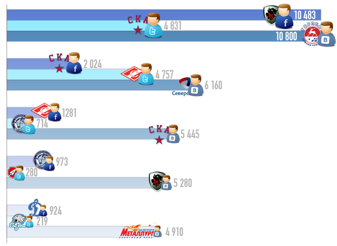 Самым востребованным клубом КХЛ, судя по статистике посещения в социальных сетях, является словацкий "Лев". На его счету около 10 тысяч поклонников, подписавшихся на обновления в Facebook. Российские хоккейные команды, по всей видимости, пока не видят смысла в столь острой необходимости пропагандировать интерес к своей команде в социальной медиа-сфере, а потому численность их групп в разы ниже. К примеру, санкт-петербургский СКА насчитывает две тысячи болельщиков в Facebook, а московский "Спартак" — около пяти тысяч в Twitter. А вот, например, у американского клуба "Нью-Джерси Девилз" на странице в сети Twitter более 36 тысяч подписчиков.
