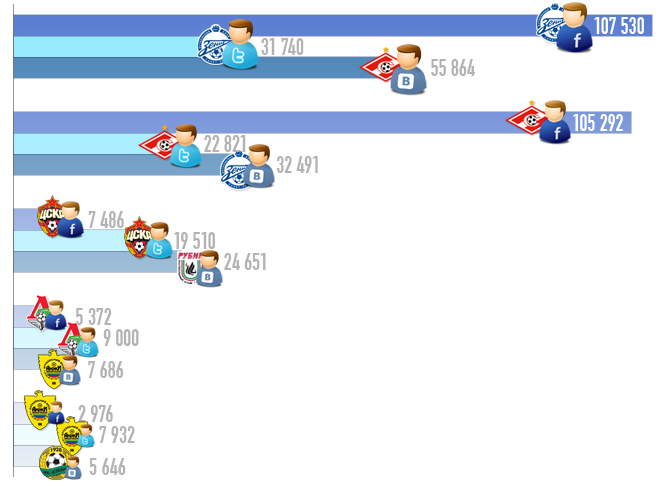 Первыми в пространство социальных медиа-ресурсов шагнули российские футбольные клубы. Так, на странице ФК "Зенит" в сети Facebook зарегистрировано более 100 тысяч пользователей. Не уступает им по численности и группа московского "Спартака". Их страницы отличает действительно высокий уровень освещения событий клубной жизни. Самое главное, что любой болельщик может поделиться своим мнением о том или ином событии, что является едва ли не основным преимуществом некоммерческой составляющей любой социальной сети.