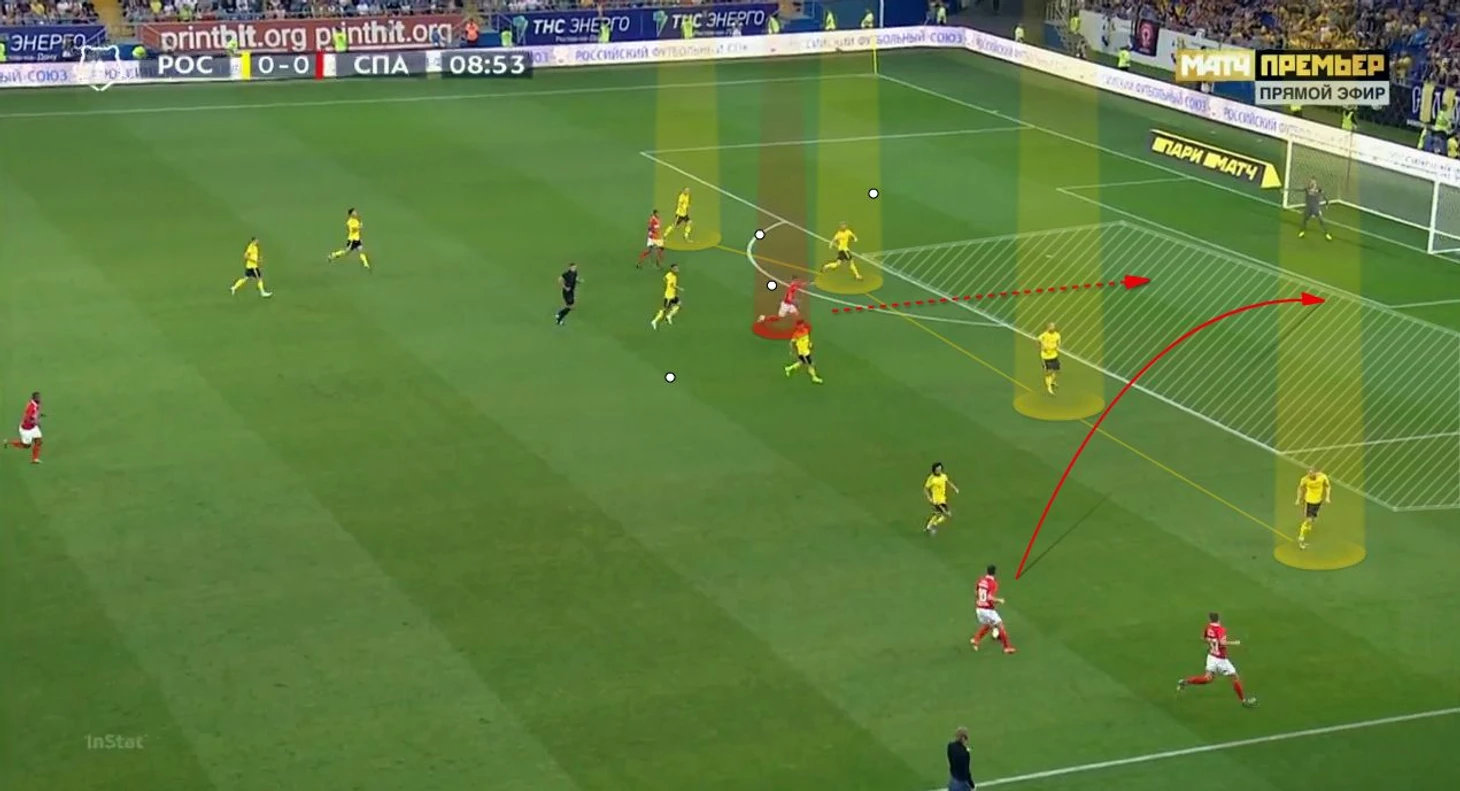 Вторым вариантом, за счет которого «Спартак» мог создавать реальную остроту у ворот соперника, были передачи москвичей в полу-позиции под врывающегося из глубины игрока. Возможности для таких вбеганий гости получали из-за слишком больших промежутков в защите «Ростова» при смещении обороны к флангу.