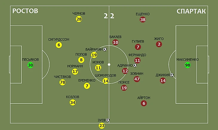 Во-вторых, это было следствием высокой рывковой активности Ионова и Байрамяна в сочетании с пасами из глубины Норманна, Еременко и Попова. Ставка делалась на открывания крайних нападающих хозяев за спину Айртону или Рассказову, а в случае перехвата передачи защитниками «Спартака» – на подбор (39 на чужой половине у «Ростова»; у «Спартака» – 23) или высокий прессинг с последующим развитием скоростной атаки через зону одного из крайних защитников, где создавались различные коалиции большинства.