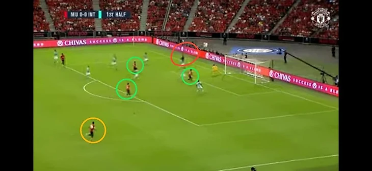 Но на фото мы видим игрока в фиолетовом кружочке,функции которого в данном контексте- подстраховать правого защитника Юнайтед. Со своими обязанностями он справился. И да-неважно кто этот игрок- по ходу всего матча игроки Манчестера менялись ролями и крайнего защитника в одном эпизоде страховал центр-хав, в другом- уже центральный защитник выходил вперед и подчищал за кем-то из любящей атаку парочки Шоу-Биссака.