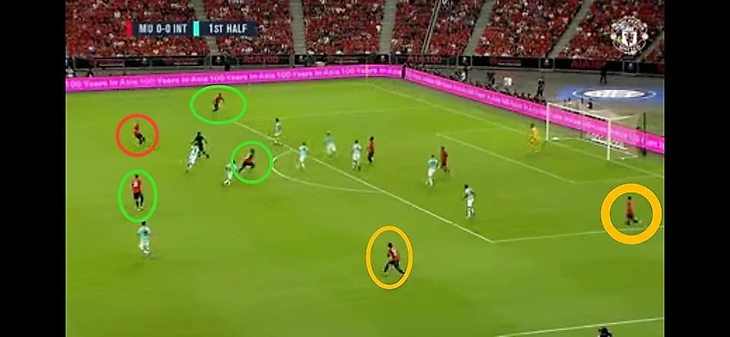2.Открывания. Открывание-это базовый элемент в футболе. Но игроки МЮ провели просто образцово-показательный матч в этом компоненте. Постоянные открывания, "сбрасывания" опекунов, смена позиций. На втором фото (внизу) в красном кружочке-игрок с мячом,он забежал в штрафную после довольно ЗРЕЛищной и ЗРЕЛой комбинации. Далее мы обращаем свой взор на игроков в зеленых кружочках- это открытые игроки.При чем двое из них находятся просто на убойной позиции. Футболист в желтом круге тут по нескольким причинам. Та же подстраховка- он должен сорвать или хотя бы замедлить контратаку Интера,в случае потери мяча его команды. Он же здесь в качестве второго темпа атаки. В случаях , когда итальянцев было больше на своей половине поля, он еще и растягивал оборону. Шоу выбирает находящегося на лучшей позиции в данной ситуации игрока- Рэшфорда. Но англичанин прощает итальянцев.