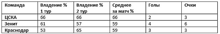 Владение не всегда ведет к успеху, но приятно болельщикам. И в этой компоненте нет равных ЦСКА – 66% - просто подавляют соперника активностью. Краснодар привычно в тройке, но пока не стабилен – сказывается отсутствие травмированных и нужной сыгранности у новичков.