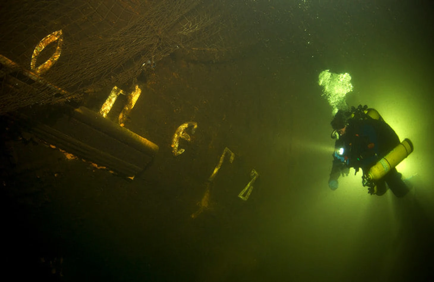– Это фрегат «Олег» – затонул в середине 19 века, стоит на ровном киле недалеко от острова Гогланд на Балтике. Так как тонул он очень быстро (ушел на дно за 15 минут) – там все сохранилось вплоть до пианино. Подводный археолог Игорь Галайда позирует, все это дело происходит на глубине 56 метров.