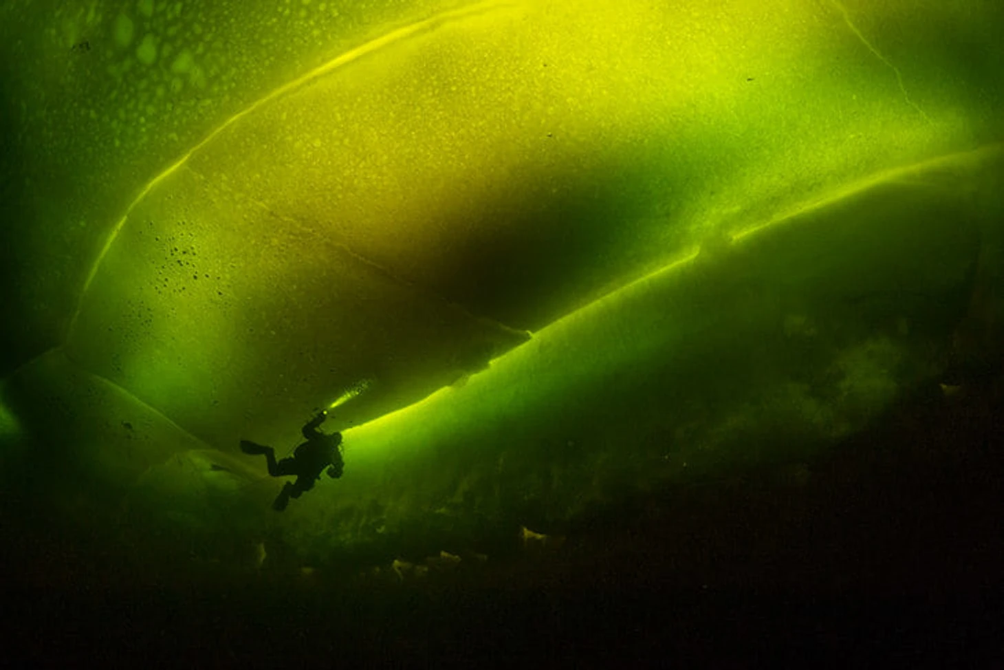 – Это не просто фотография, а панорама из восьми вертикальных кадров. Я нырнул туда, расставил людей под водой, выбрал места, где будут стоять они и я. Еще мы расчистили сверху снег, чтобы лед был прозрачным, и повысили освещенность этого места. Потом я нырнул, поставил штатив, а на него – камеру с панорамной головкой. Значится, дайверы привязались к грузам, потому что там течение и их сносит, а мне было нужно, чтобы они находились на одном месте.