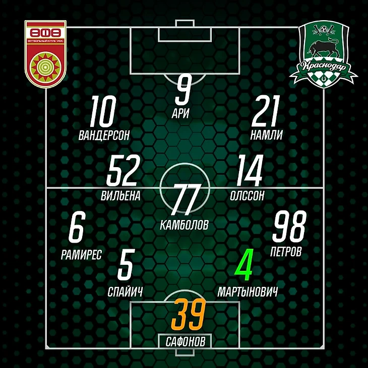 Еще к примеру Ари с Игнатьевым умещаем на поле. К этом Краснодар часто прибегает когда нужно отыгрываться во вторых таймах, но по сути это те-же 3:3. Просто Ари находится чуть выше Вильены. При обороне, Вильена в целом смещается во второго опорника, а Ари распологается между 2 опорниками Камболова и Вильены (исполняющую эту роль при обороне). Потому-что Ари может цепляться за мячи и хорошо работает корпусом, что помогает ему в борьбе если мячи выносят со штрафной. Это просто более агрессивная опция для нас. Но с точки зрения схемы ничего не меняется.