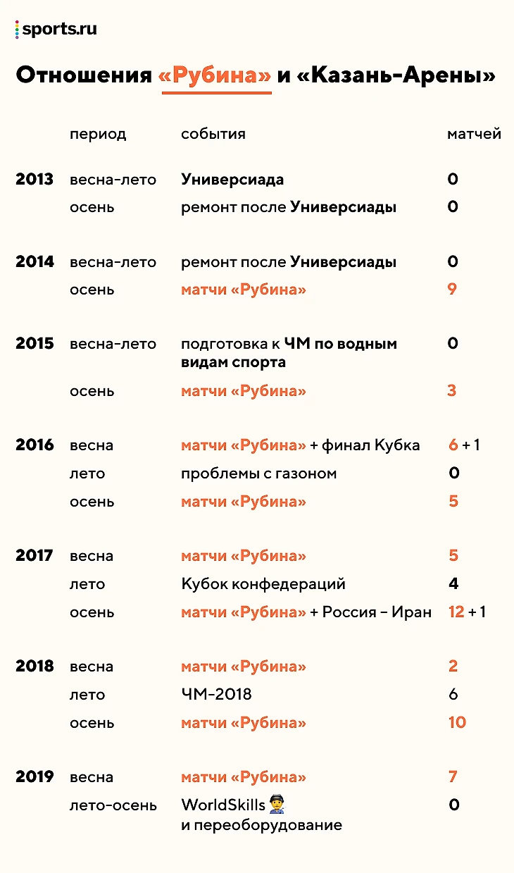 • Дальше казанцы спокойно базировались на новом стадионе, наступила эпоха относительной стабильности. Сезон-2016/17 доиграли на «Казань Арене», первая половина РПЛ-2017/18 тоже прошла там. Только весной 2018-го «Рубин» провел на «Казань Арене» два матча – чтобы не уничтожить газон перед чемпионатом мира. После ЧМ все тоже было нормально.