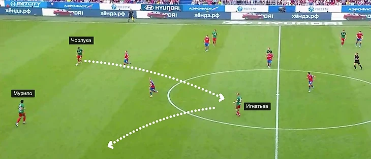 В первом эпизоде Игнатьев вернул мяч назад Чорлуке – качественный пас хорвата вперед, по сути, пропал. Во втором эпизоде Игнатьев пытался развернуть атаку через Мурило, но передача получилась неточной – мяч ушел в аут.