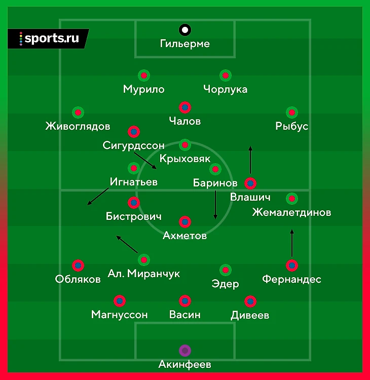 В начале второго тайма Живоглядов получил травму и был заменен на Смолова. Скорее всего, Семин сразу после перерыва перешел на чистые 4-4-2 с Игнатьевым в роли правого полузащитника и Алексеем Миранчуком на одной линии с Эдером, но у нас было слишком мало времени (и позиционных атак ЦСКА), чтобы оценить правильность этой теории. С выходом Смолова стало легче: Игнатьев ушел на правый фланг обороны, Миранчук – полузащиты.