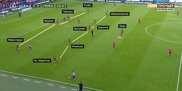 При позиционных атаках ЦСКА «Локо» действовал по схеме 4-5-1: Алексей Миранчук садился на правый край.