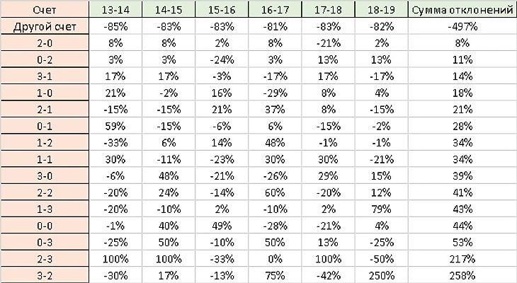 Моя главная ошибка перед 3 туром была что не составил именно такую таблицы и не увидел, что счет 0-0 имеет колебание в 44% от сезона к сезону и данный счет не постоянен и применение среднего значения к нему не даст положительного эффекта.