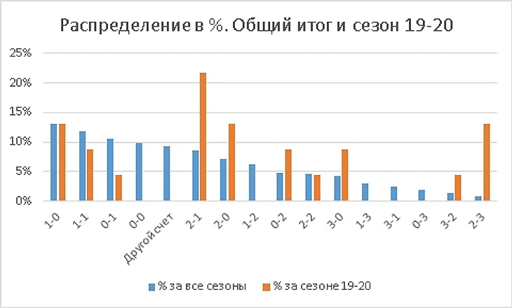 Распределение в % по итогу 6 сезонов по каждому счету и % счетов на сезон 19-20. В нем видно, что идет большой недобор по счету 2-1 и перебор по счету 2-3 И есть в % соотношении недоборы по другим счетам, в том числе не было исходов на 0-0 и на ставку «ДРУГОЙ СЧЕТ», все что выше 3 голов одной из команд.