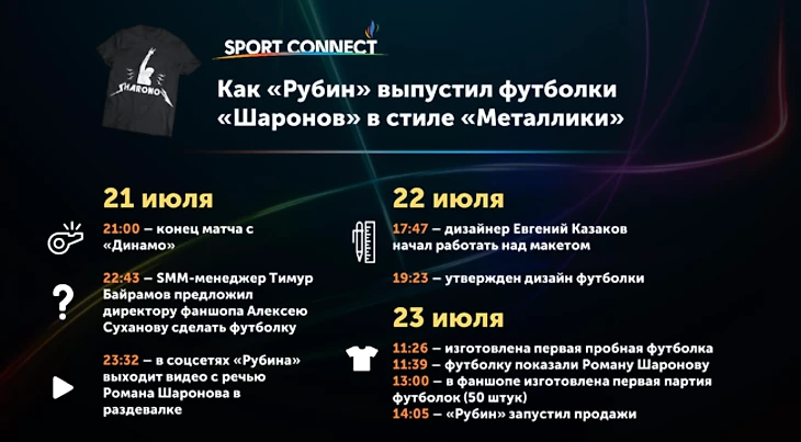 Через полтора дня, в середине вторника, когда сюжет, казалось, пошел на спад, «Рубин» сделал резкий поворот и объявил о продаже футболок с силуэтом Шаронова и стилизацией под «Металлику». Их можно заказать в онлайн-магазине и купить в фаншопе на стадионе «Центральный».