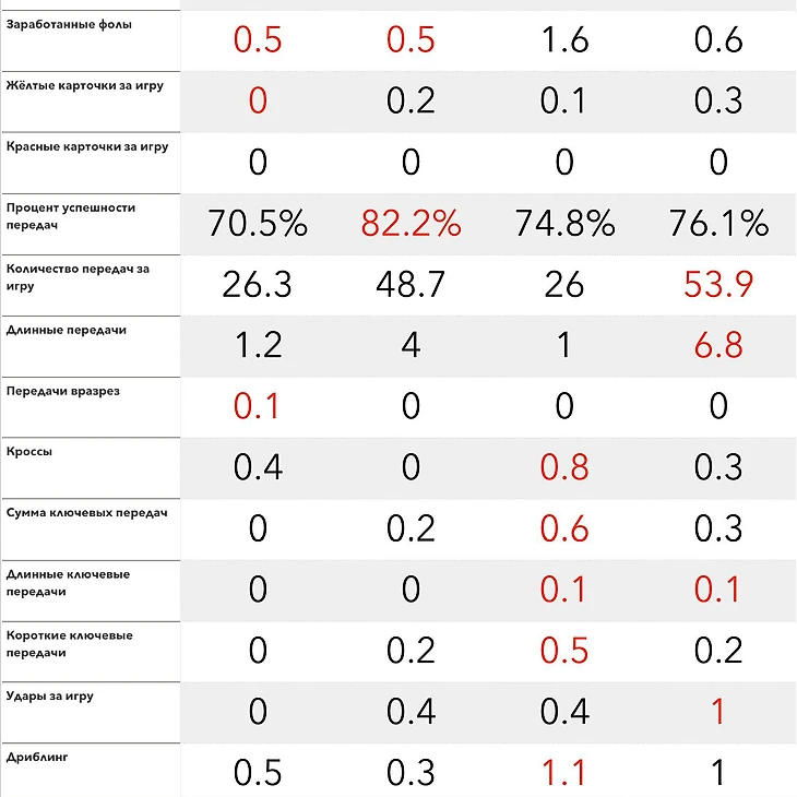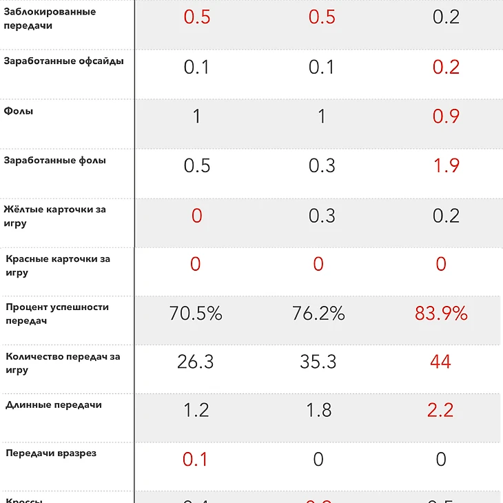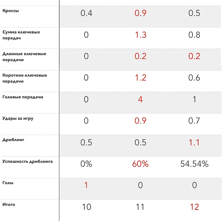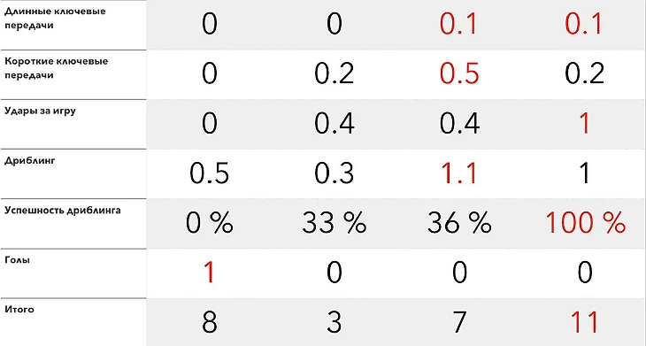 По кроссам он на 6 месте во всей команде, делая их в среднем по 0.4 за два тайма.