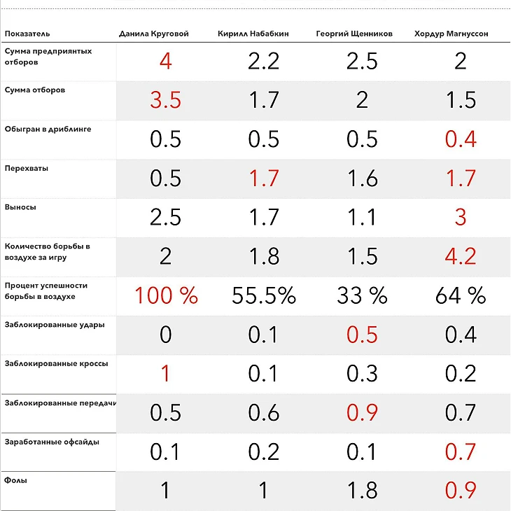 Итак, как уже говорилось, Данил Круговой – самый отбирающий игрок уфимской команды среди игроков обороны. За игру он пркдпринимает по 4 попытки отбора, 3.5 из которых увенчиваются успехом, то есть пооцент удачных отборов 87.5 %. По этому показателю он номер один в команде