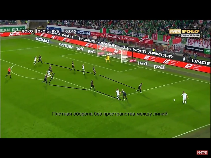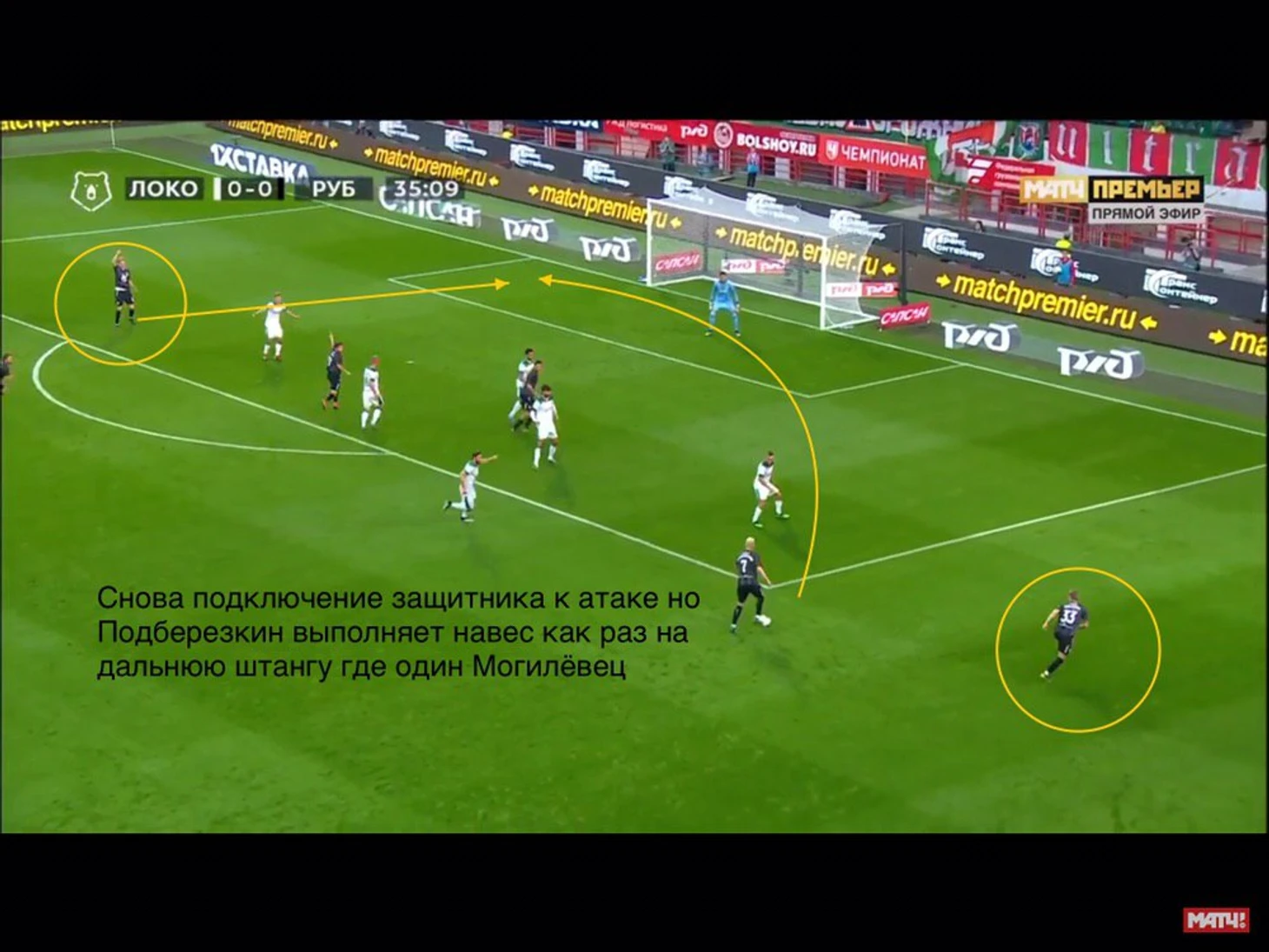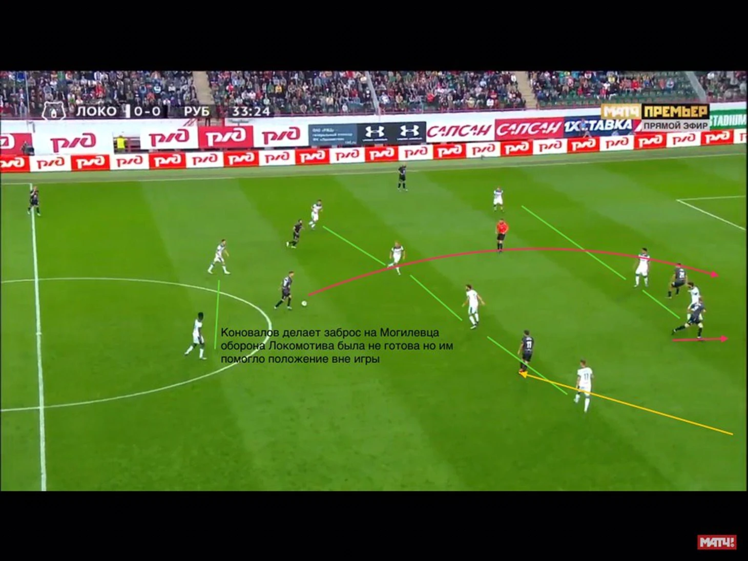 На этом скриншоте видно, что игроки меняются позициями Зурико ( отмечен жёлтой стрелкой ) с правого фланга опускается в линию игроков Локомотива для поддержания атакующий структуры а Могилевец делает туда забегание под передачу.