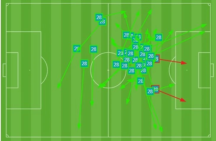 За свой тайм Пуч сделал всего 2 неточных передачи (из порядка 33), согласно схеме, которой поделился @alexdelmas10, если соотношение таково, то у него 93%-ная точность передач, но из-за отсутствия звездного имени Рики это вряд ли заинтересует многих.