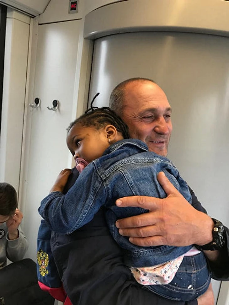 Николай успокаивает плачущего ребенка в поезде в Германии