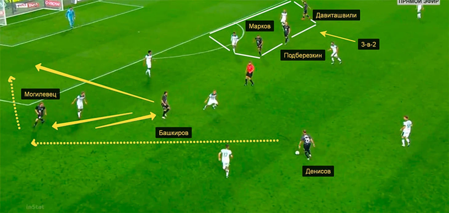 На 55-й минуте Подберезкин бил с левой из центра штрафной. Момент возник после смены позиций Башкировым (ушел из края в левый полуфланг) и Могилевцем (из центра – во фланг). Также «Рубин» имел численное преимущество на дальнем углу штрафной: Марков, Подберезкин и Давиташвили остались против Чорлуки и Рыбуся. Денисов мог, например, отдать передачу на забегание Подберезкина в зону между защитниками «Локо».
