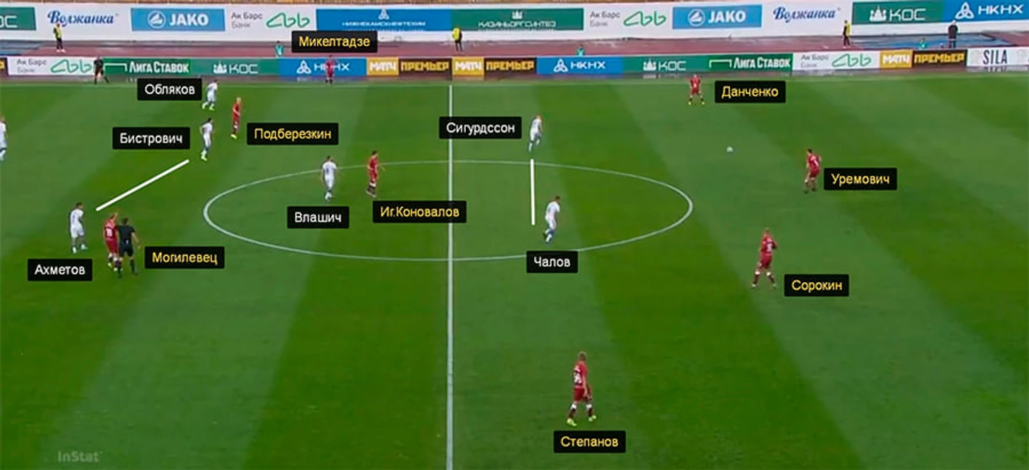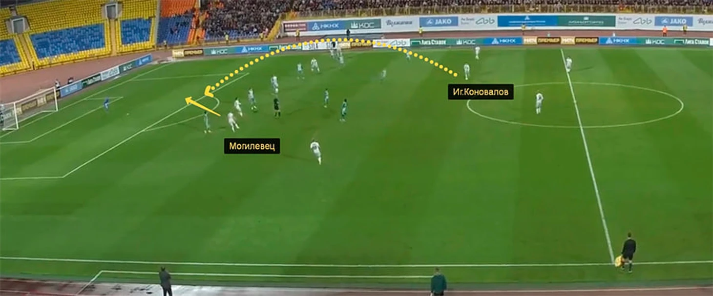 В матче с «Динамо» против Коновалова чаще всего действовал Себа Шиманьски, в игре с «Ахматом» нападающие грозненцев Олег Иванов и Аблай Мбенг располагались слишком широко – Коновалов получал передачи от Уремовича и Сорокина между ними. Из-за этого из опорной зоны «Ахмата» выбрасывался Михаил Гащенков и оставлял большую зону за спиной – вся структура «Ахмата» рушилась.