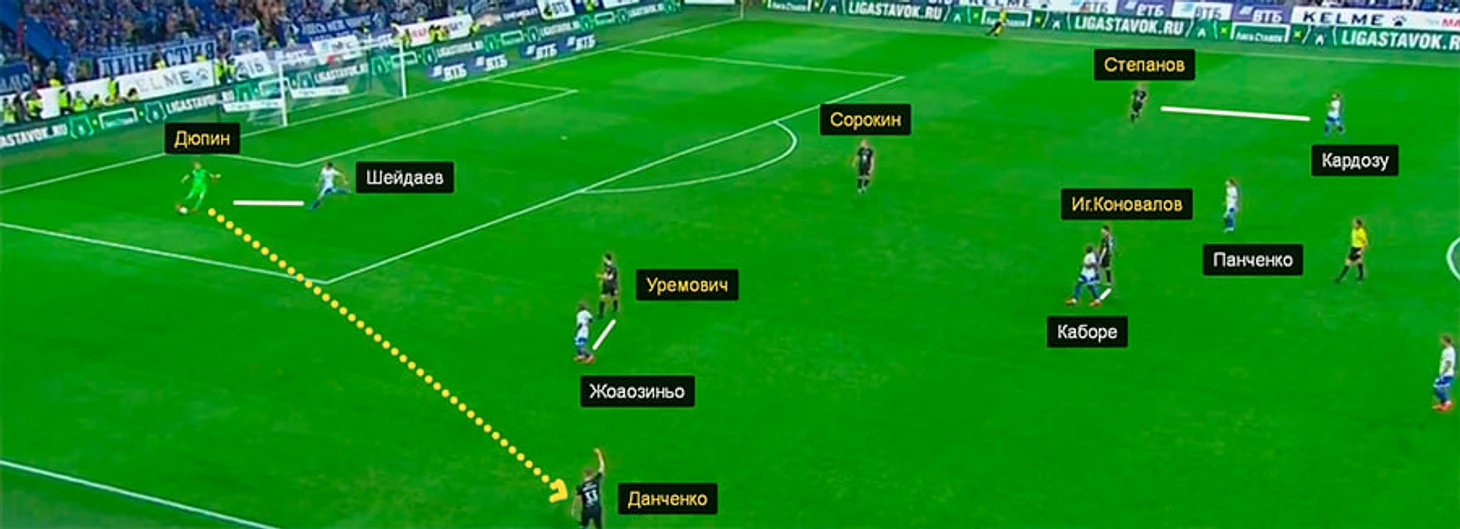 За четыре тура у Дюпина было два очень неудачных выноса после передач от защитников – против «Локомотива» и «Динамо». К ответной атаке привел лишь один – Мурило забрал мяч в центральном круге и отпасовал к финальной трети на Алексея Миранчука.
