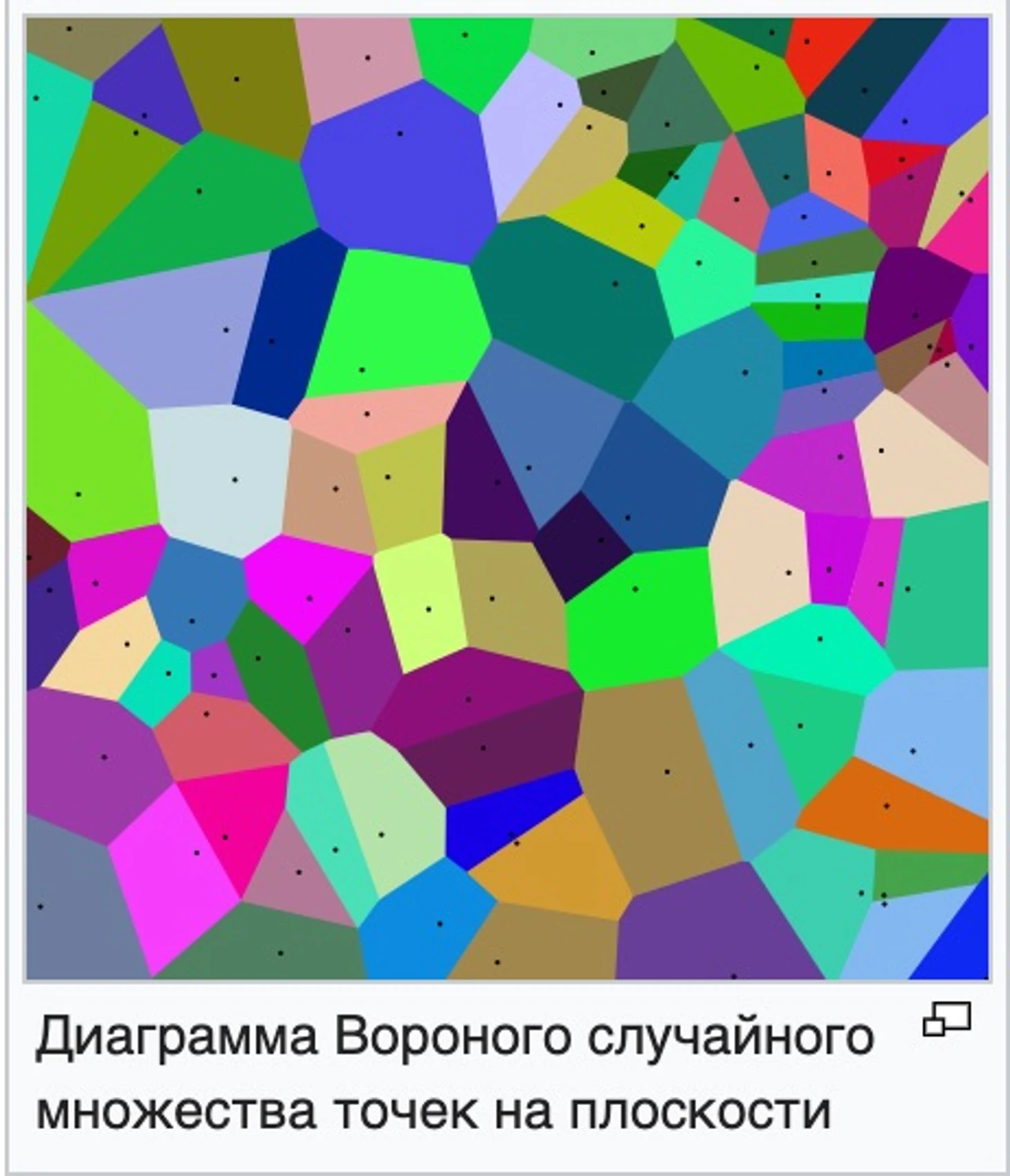 Что такое Диаграмма Вороного? Если вы еще не “завикипедили”: в математике Диаграмма Вороного конечного множества точек S на плоскости представляет такое разбиение плоскости, при котором каждая область этого разбиения образует множество точек, более близких к одному из элементов множества S, чем к любому другому элементу множества.