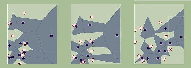 Мы используем значения ожидаемых угроз Каруна Сина и, как образцовый игровой эпизод, мы берем первый гол "Аякса", который был забит в ворота "ПСВ" во время недавнего матча за Суперкубок Голландии. Здесь мы видим три ключевых момента того игрового эпизода, обработанные Диаграммой Вороного: