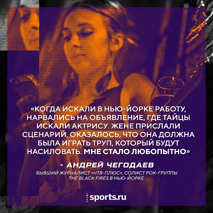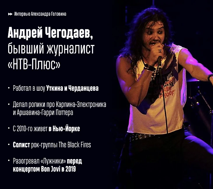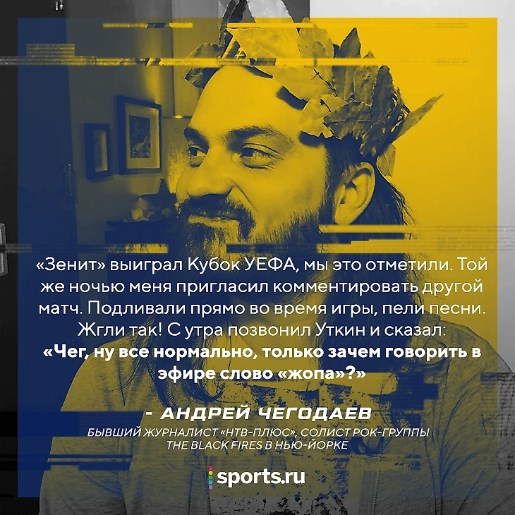 Андрей Чегодаев – бывший журналист «НТВ-Плюс». Если вы смотрели спортивное ТВ десять лет назад, то наверняка помните видео про Карпина-Электроника, Аршавина-Гарри Поттера или «Пиратов Карибского моря» в Лиге чемпионов. Сценарии ко всем роликам писал именно Чегодаев. Еще он работал в «Футбольной ночи» с Черданцевым и Лопыревой, а в 2010-м неожиданно бросил работу и уехал в Нью-Йорк, где живет до сих пор. В США журналист создал рок-группу The Blackfires, с которой уже дважды возвращался в Москву – в 2014-м выступал на разогреве Aerosmith в «Олимпийском», а 31 мая 2019-го – Bon Jovi в «Лужниках».