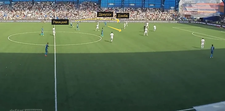 В игре Дзюбы почти ничего не изменилось по сравнению с весной – он очень часто подыгрывает партнерам. В промежуточных стадиях атак Артем обычно действует в полуфлангах и флангах – там он может получить передачу низом или диагональ от Ракицкого и Ивановича.