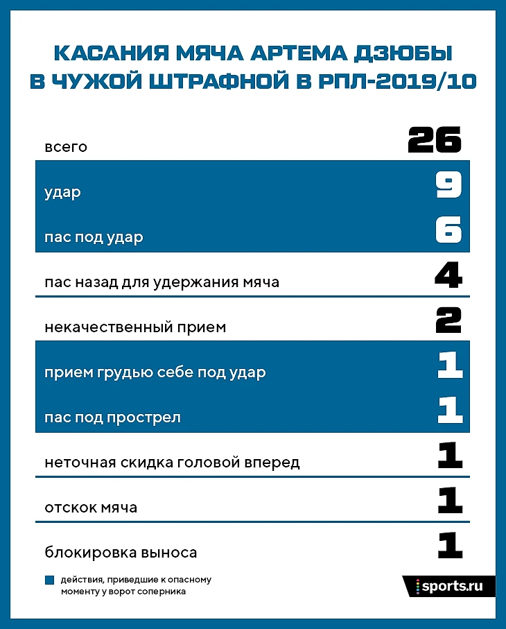Ранней весной 2019-го, когда Дзюба стал играть в глубине, Семака спрашивали, когда Артем забьет сам. Сейчас никаких вопросов нет: Дзюба – один из лучших бомбардиров лиги. Во-первых, он стал получать мяч в чужой штрафной чаще, чем весной (6,2 касания за 90 минут в РПЛ-2019/19 – больше только у Шомуродова и Ари), во-вторых, Дзюба вообще не делает лишнего – большинство движений очень опасны.