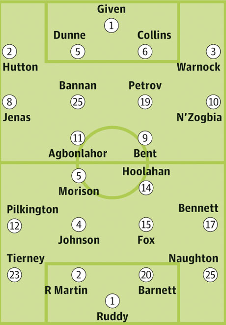 Алекс Маклиш планирует дать возможность дебютировать находящемуся в аренде Джермейну Дженасу, который только восстановился о травмы ахилла. Барри Бэннан также, скорее всего, вернется на поле. Только победа позволит «Вилле» обогнать «Норвич» в таблице, расположившийся на 8 месте. Фантастическое начало сезона «канареек» не в последнюю очередь произошло благодаря нападающему Гранту Холту, который в двух последних матчах спасал команду от поражения. Тем не менее, если он хочет провернуть этот трюк в третий раз, то ему снова придется начинать мать со скамейки запасных.