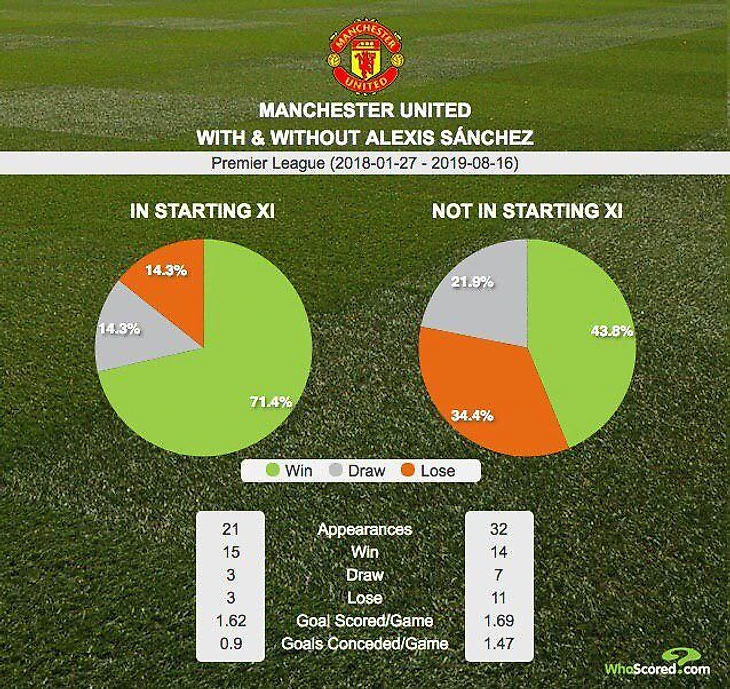 WhoScored представляет процентное соотношение побед, ничьих и поражений «Манчестер Юнайтед». При наличии в составе Санчеса процент побед гораздо выше: