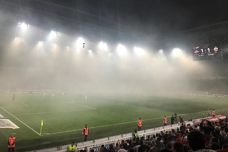 Шоу продолжили фанаты ЦСКА, которые добавили огня. В прямом смысле: в ход пошла пиротехника, из-за которой матч был приостановлен.