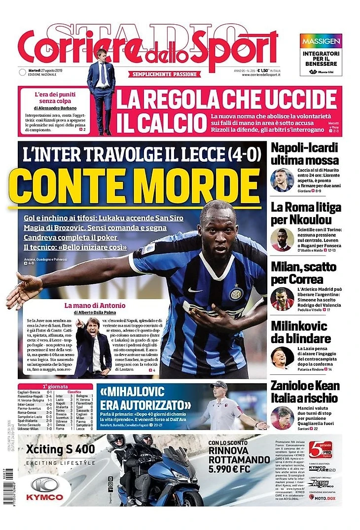 Спринт на старте, покер против «Лечче». Рука Конте хорошо заметна и 65000 на «Сан Сиро» восхваляют его, новички сразу эффективны и «старики» восстановились. Забили Брозович, Сенси, Лукаку и Кандрева. Тренер доволен: «Но это не искра: хочу динамита».