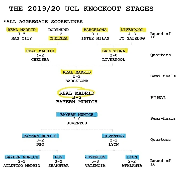 Везде, кроме финала, счет указан по сумме двух матчей.