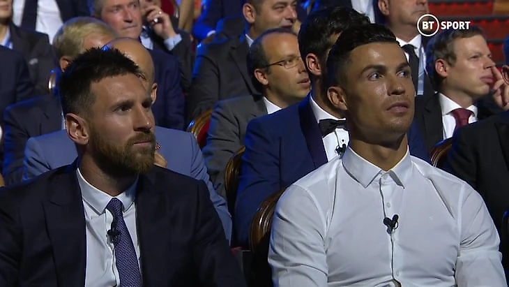 Зал переваривал слова француза, а Месси и Роналду слушали вот с такими лицами.