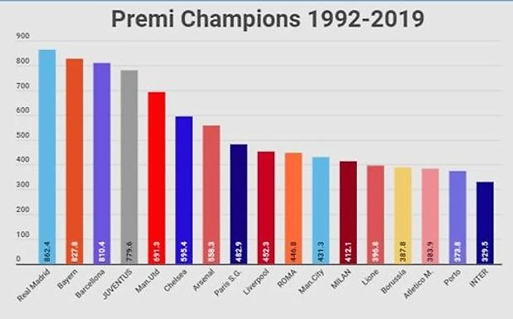 Коротко, участие в Лиге чемпионов приносит клубам богатые призовые. Это также подтверждается оценкой «La Gazzetta dello Sport», которая составила рейтинг клубов, заработавших наибольшее количество наград с 1992 по 2019 год.