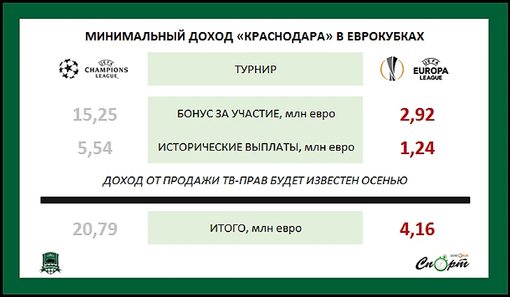 ● 15,25 млн евро краснодарцы получили бы только за участие в групповом раунде.