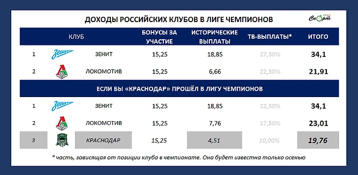 В свою очередь, «Зенит» окажется в плюсе из-за вылета «Краснодара» благодаря дополнительным доходам от ТВ-прав. Чем больше в какой-либо стране заплатили за показ Лиги чемпионов, тем больше УЕФА платит представителям этой страны. Выплаты клубам каждой ассоциации делятся на две равные части: