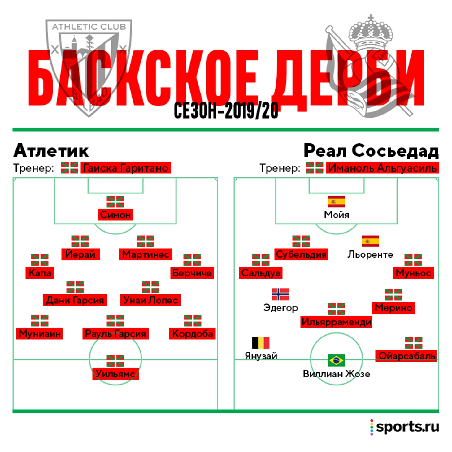 • Тренеры обеих команд – тоже баски. Коуч «Атлетика» Гаиска Гаритано родился неподалеку от Бильбао и играл как за команду, которую теперь тренирует, так и за принципиального соперника. Главный «Сосьедада» Иманоль Альгуасиль родился в Сан-Себастьяне и тоже играл за родной клуб. Позже Альгуасиль тренировал в молодежной системе команды, а в прошлом декабре его назначили главным тренером.
