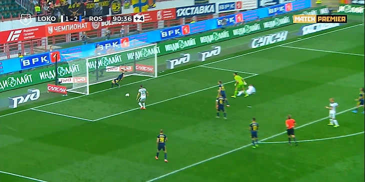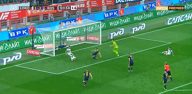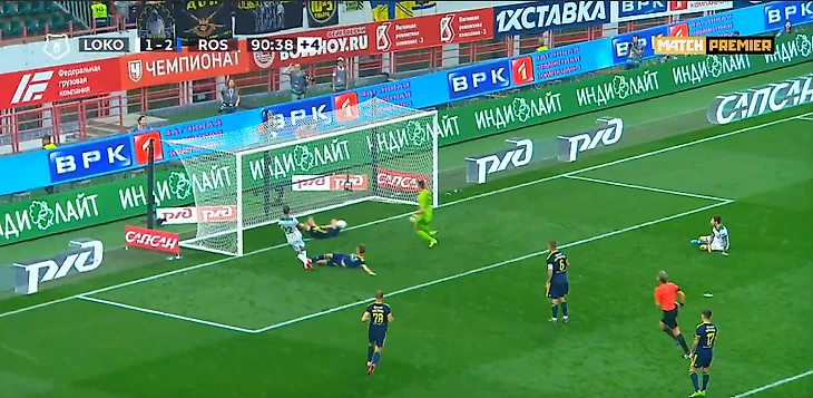 На первой добавленной минуте голкипер «Ростова» Бабурин неудачно сыграл на выходе после подачи с фланга, Федор Смолов головой пробил по пустым воротам, но левый защитник Чернов успел добежать до ленточки и вынес мяч.