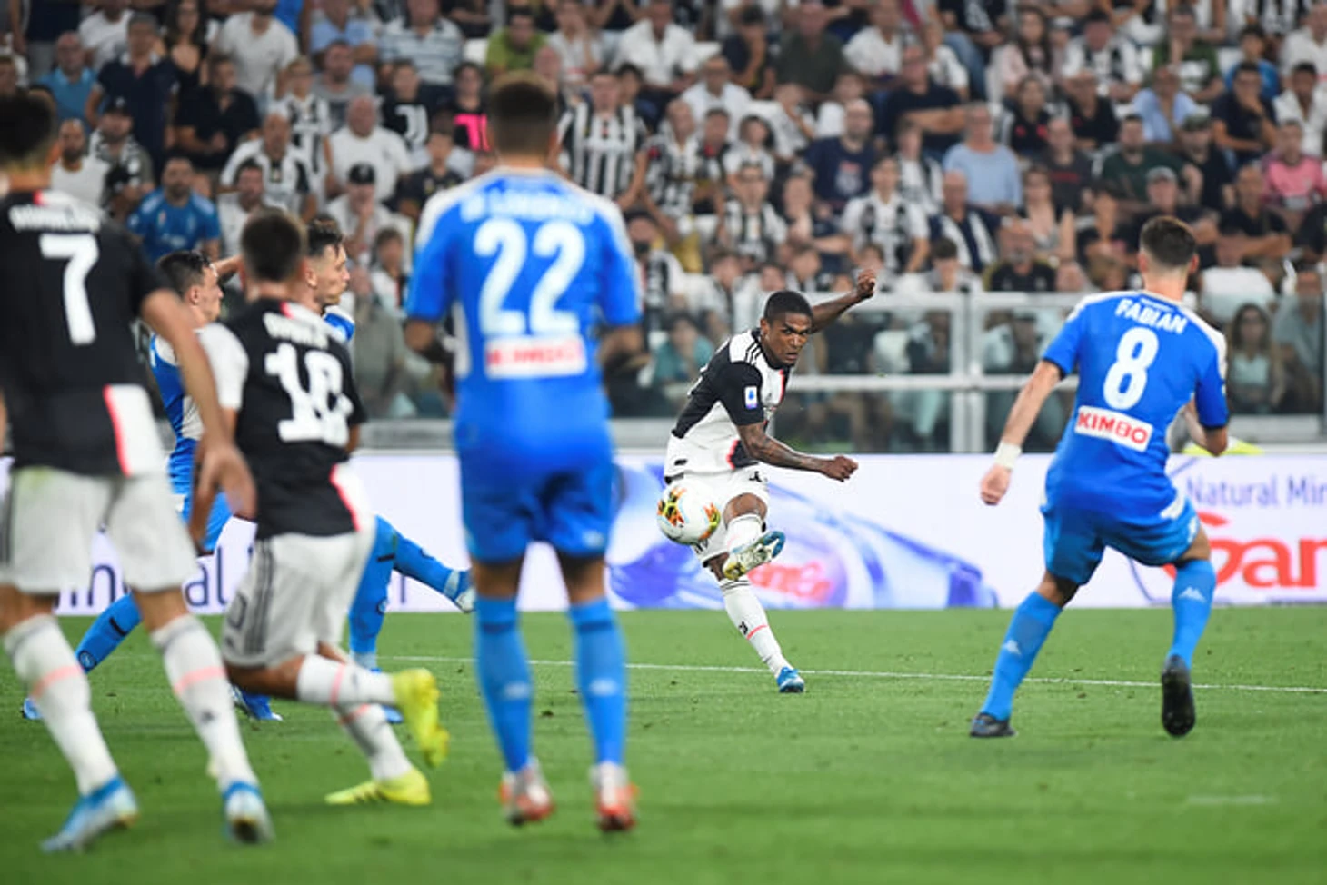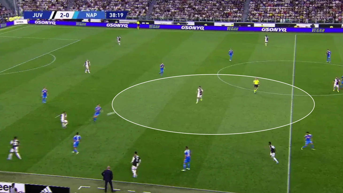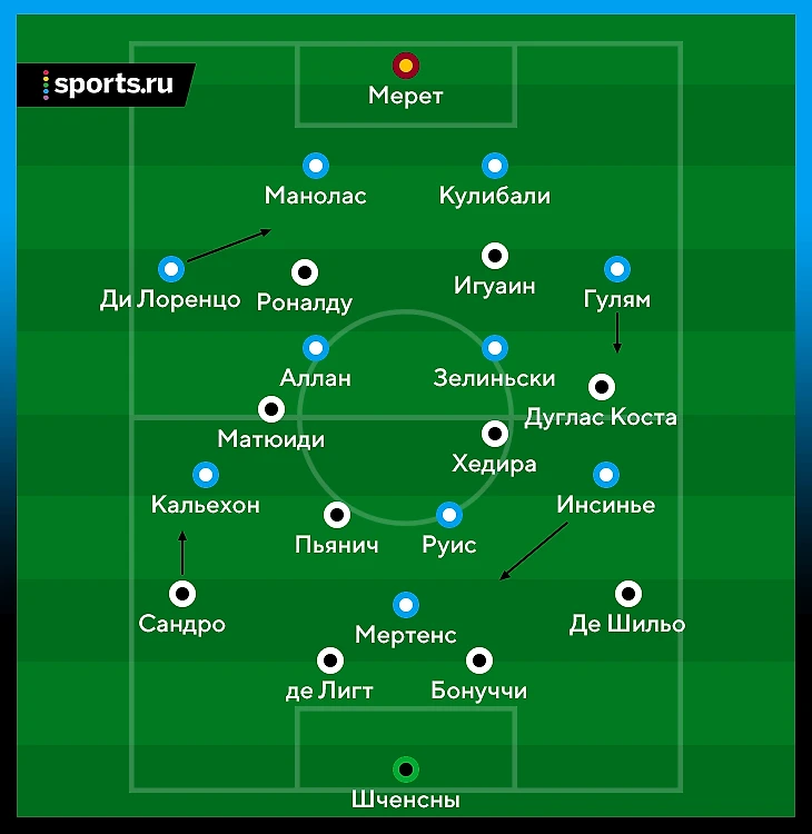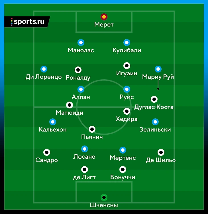 В атаке «Юве» использовал схему 4-3-3, что давало им преимущество в центре поля (3-в-2 – Пьянич, Хедира, Матюиди против Аллан и Зелиньского). Треугольник хозяев всегда грамотно располагался и растягивал опорников соперника.