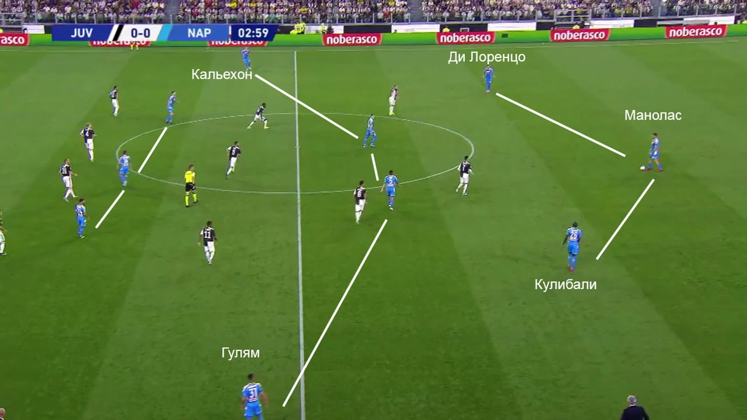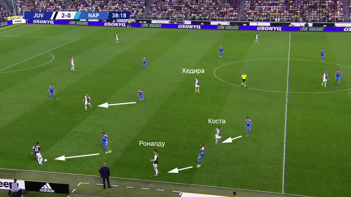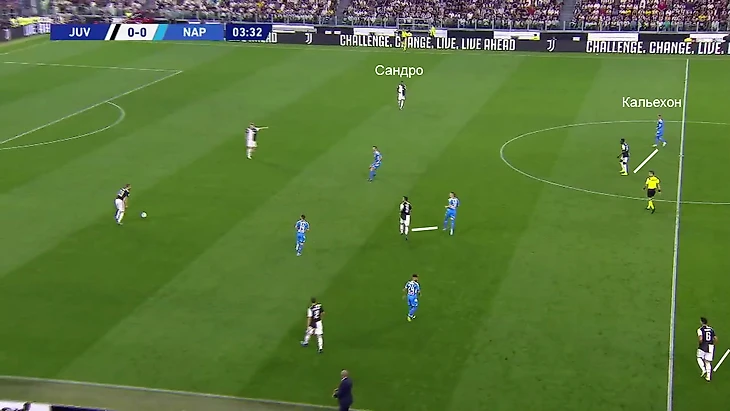 «Юве» отлично понимает, как обороняется соперник, поэтому быстро переводит мяч к Алексу Сандро. Из-за персональной игры в центре Аллан и Зелиньски заняты Хедирой и Пьяничем, с Матюиди приходится играть Кальехону. В то же время именно Кальехон вынужден прессинговать Сандро – нужно разрываться: