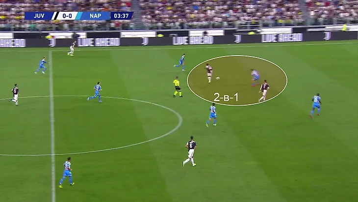 Фишка «Юве» была в том, что Матюиди изначально держит Кальехона около себя, а потом в оптимальный момент начинает рывок – передать его защитникам было очень трудно, особенно учитывая, что Ди Лоренцо почти всегда отвлекал Роналду или Игуаин: