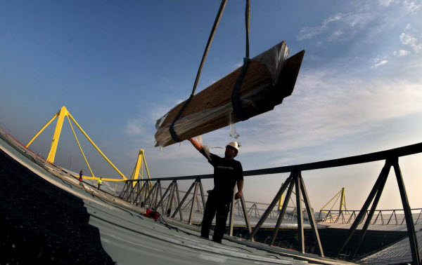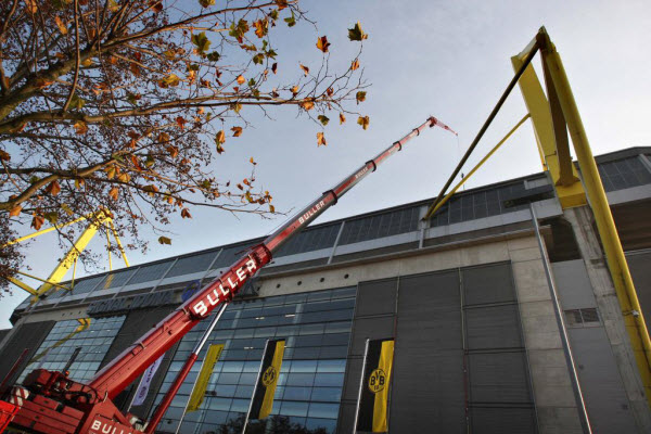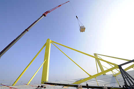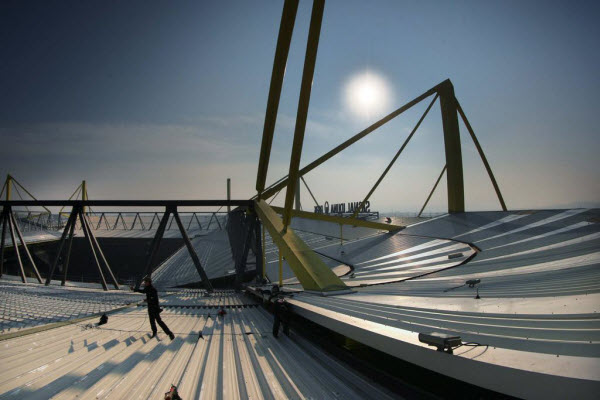 Интересная особенность: на северной трибуне солнечные модули невольно образовали огромный логотип самой «Боруссии». В целом, такими модулями была охвачена площадь в 8272 кв.м.! А для работы использовался огромный кран, чтобы поднять модули и элементы на высоту 38 м.
