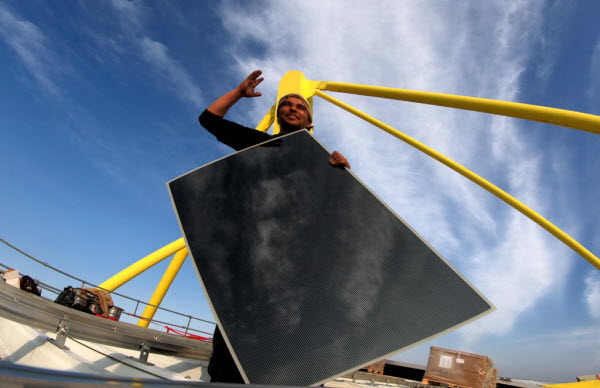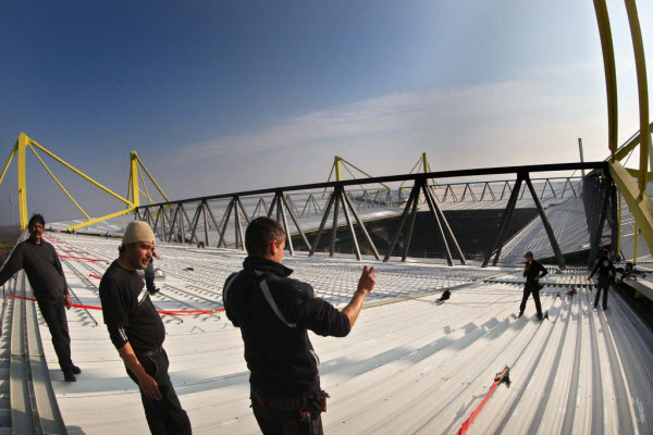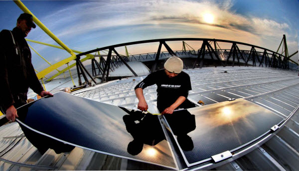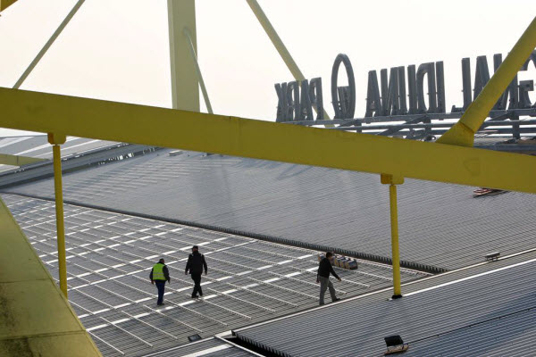 В то время, как стадион дортмундской «Боруссии» отдыхает от шума и будней Бундеслиги, недавно на крышах северной, западной и восточной трибун Вестфаленштадиона было установлено 8160 солнечных модулей. Они так же дополнились другими 608 солнечными модулями на фасаде самого крупного футбольного стадиона Германии. Все это относится к сути спонсорского договора между «Боруссией» и фирмой Q-Cells. Солнечные коллекторы на Вестфаленштадионе, таким образом, должны покрыть те дополнительные энергетические издержки в размере 200000 евро в год, которые возникают из-за работы системы освещения самого футбольного поля.